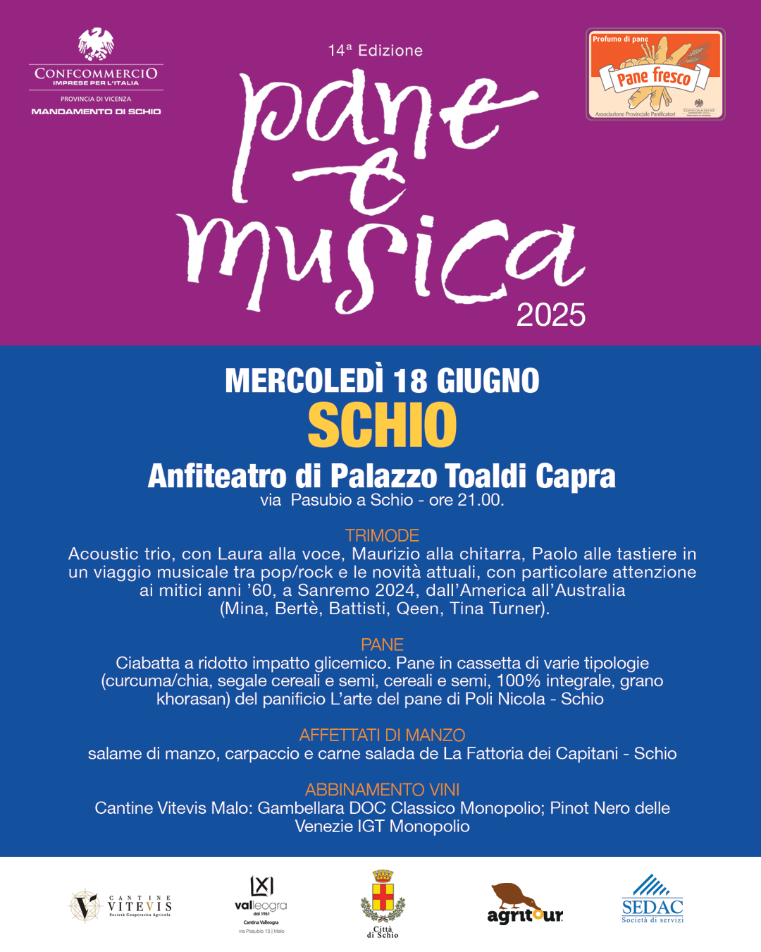 Una splendida serata di musica e sapori ha animato l’Anfiteatro di Palazzo Toaldi Capra per l’edizione 2025 di Pane e Musica. I protagonisti della serata sono stati anche i nostri prodotti del Panificio Arte del Pane, che hanno accompagnato il pubblico in un viaggio di gusto tra pane di qualità e specialità del territorio. Un momento di festa e condivisione per tutta la comunità.